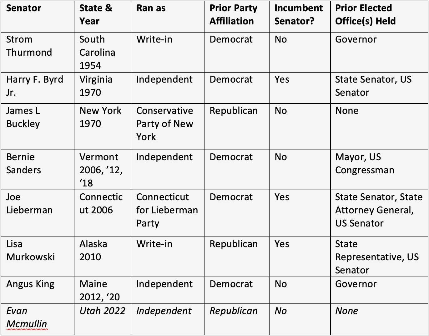 McMullin’s campaign faces significant historical headwinds. Credible independent or third-party Senate candidates, although unusual, are far from unique. Since the end of World War II, 38 independent or third-party senate campaigns have garnered at least 15% of the vote. Of those 38 candidates, only seven successfully won a senate seat. Of those seven, three – Harry F. Byrd Jr., Joe Lieberman, and Lisa Murkowski – were incumbent Senators who had previously been elected as either Democrats or Republicans, and three others – Strom Thurmond, Bernie Sanders, and Angus King – had previously won multiple statewide elections to other political offices. Only one, James L. Buckley, was elected to the US Senate in 1970 from the state of New York on the Conservative Party ticket with no prior experience in elected office. In 2022, McMullin is seeking to replicate this exceedingly rare feat.