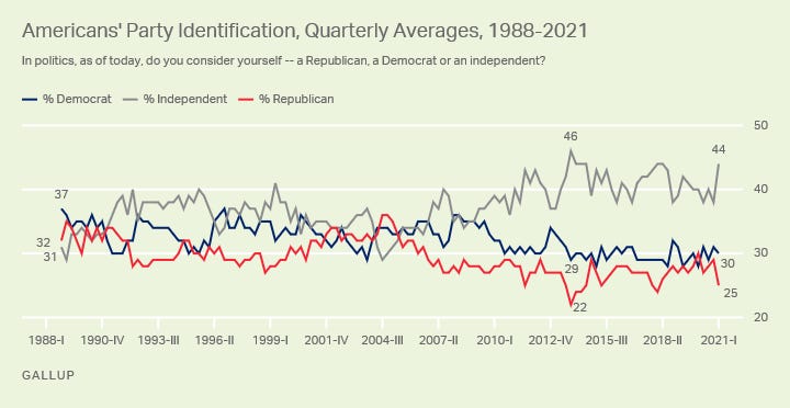 The present national environment has grown unusually favorable for politically independent candidates. In a January 2021 Gallup poll, 50% of American voters surveyed identified as politically unaffiliated. In the more than 40 years that Gallup has polled this question, the number of self-identified independents had never before reached a majority. This unprecedented result is part of a broader trend. In 1988 when Gallup first asked, roughly 30% of Americans identified as independents. That percentage has climbed steadily upward since 1988 and today averages around 45%, with neither major party consistently holding the loyalty of more than 30% of voters.